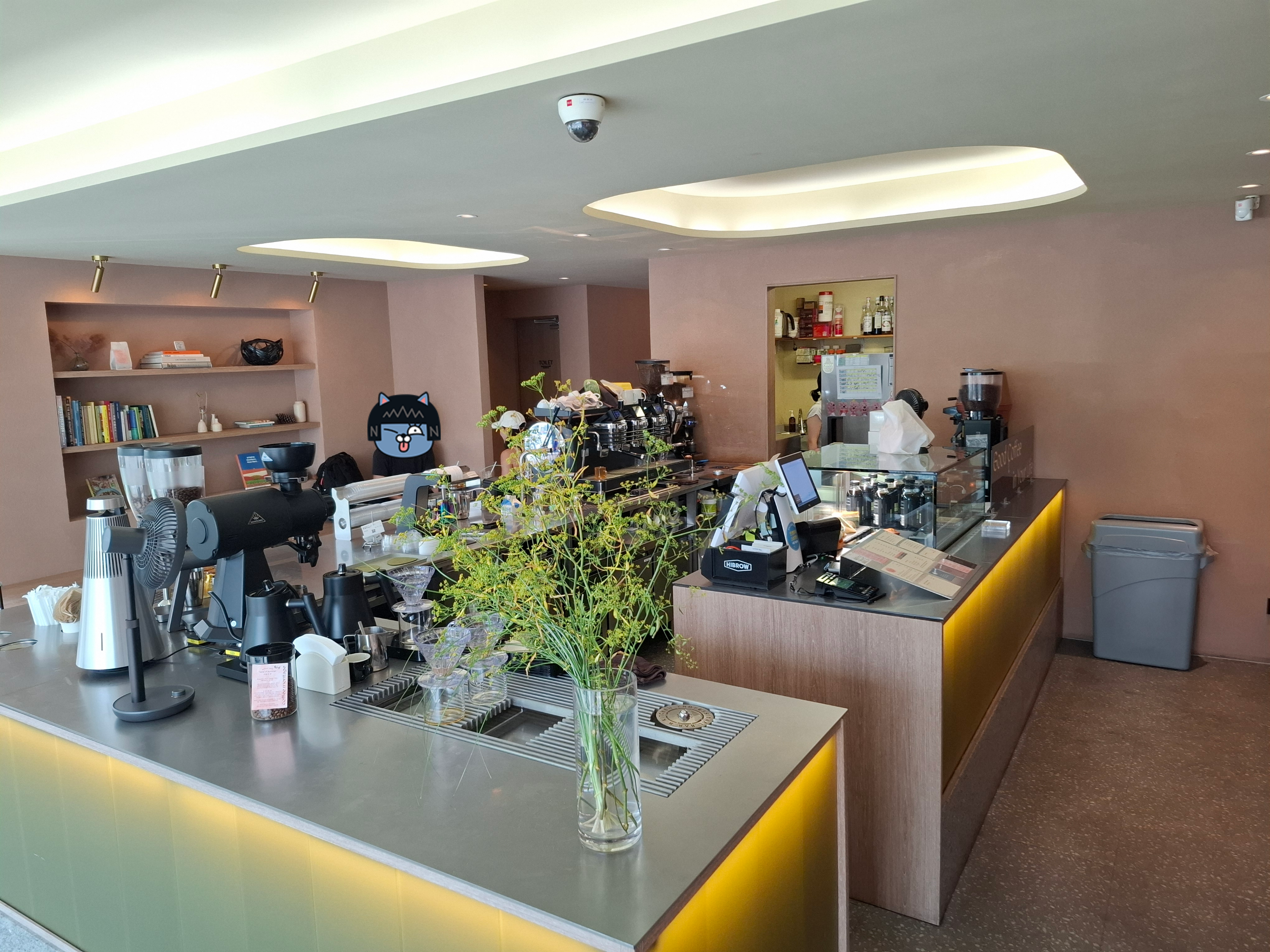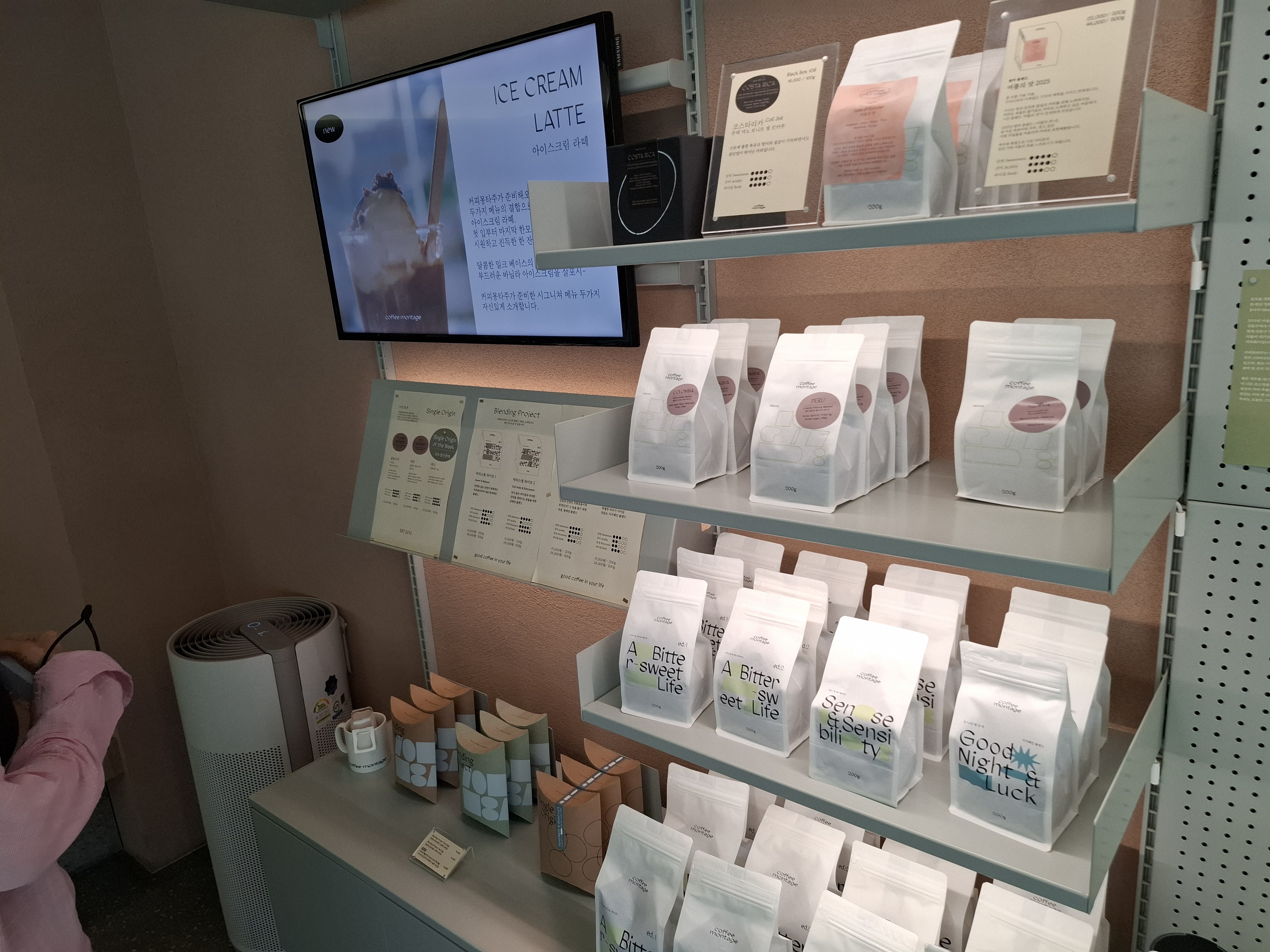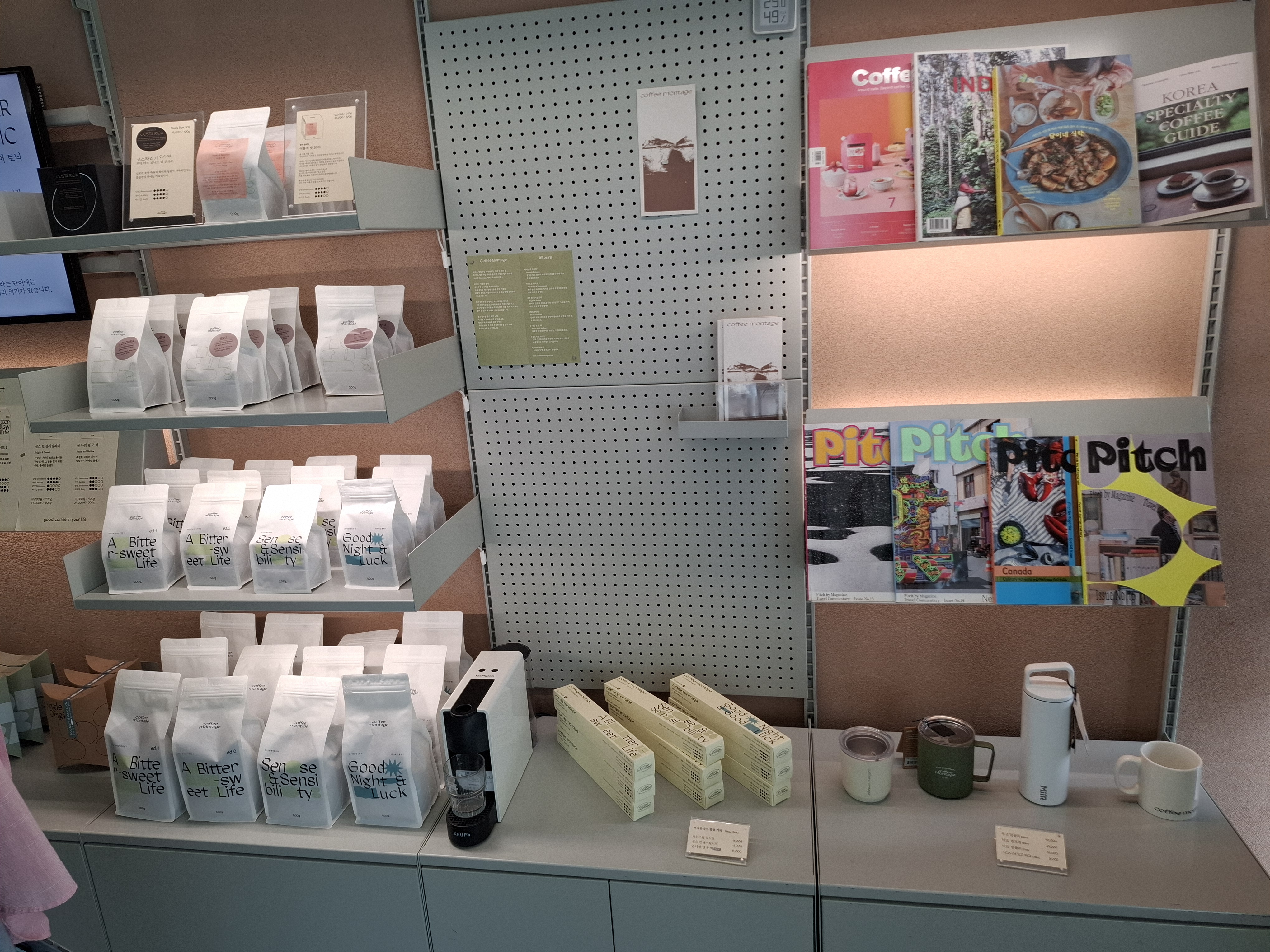 한쪽 벽면에는 다양한 종류의 원두와 굿즈들이 진열되어 있었습니다. 패키지 디자인도 감각적이라 선물용으로도 아주 좋아 보였어요. 원두 라인업만 봐도 커피에 얼마나 진심인 곳인지 알 수 있었습니다.