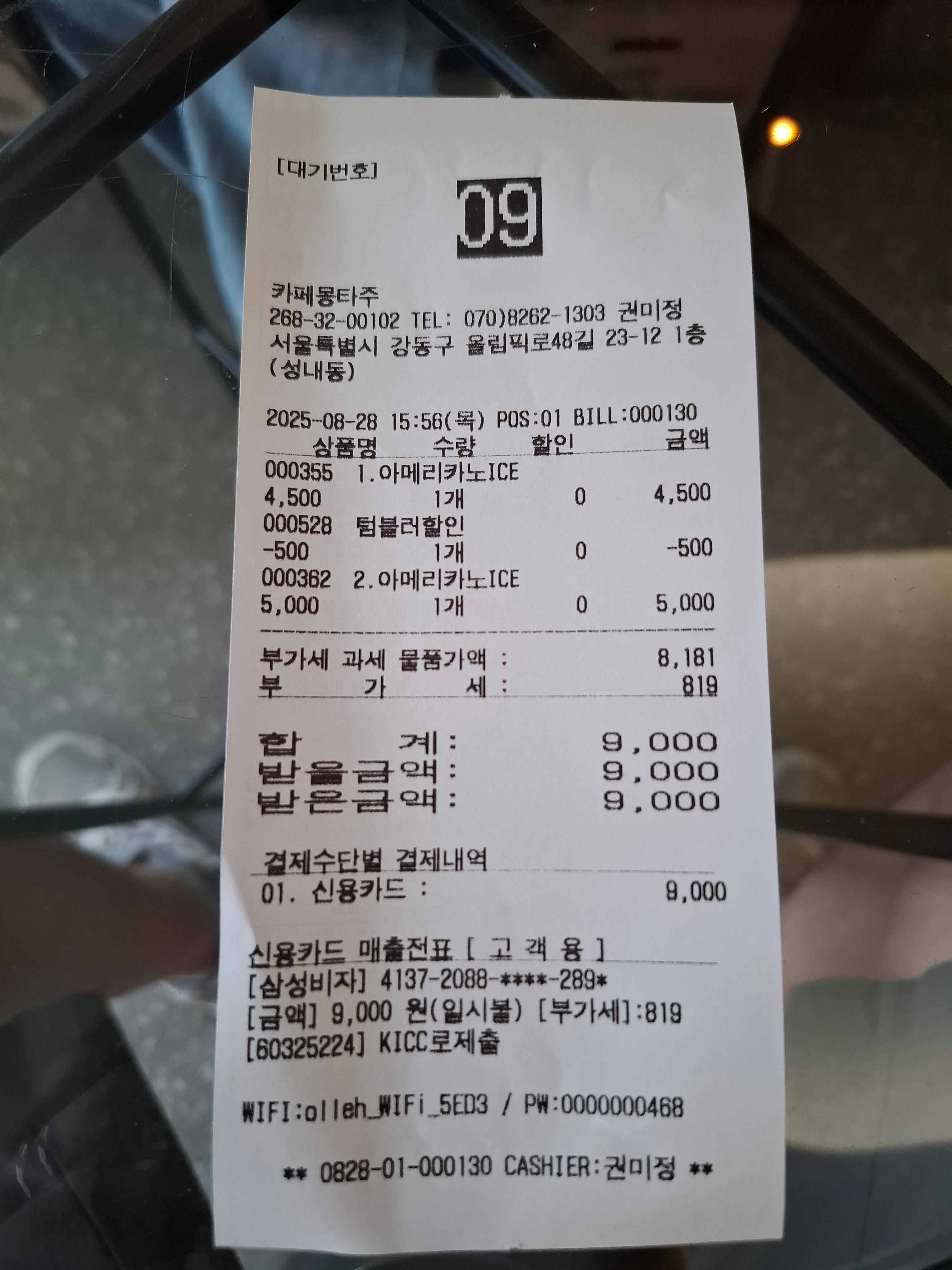 영수증에는 와이파이 비밀번호가 있으니, 그냥 버리지 마시고 확인하시는게 좋아요!