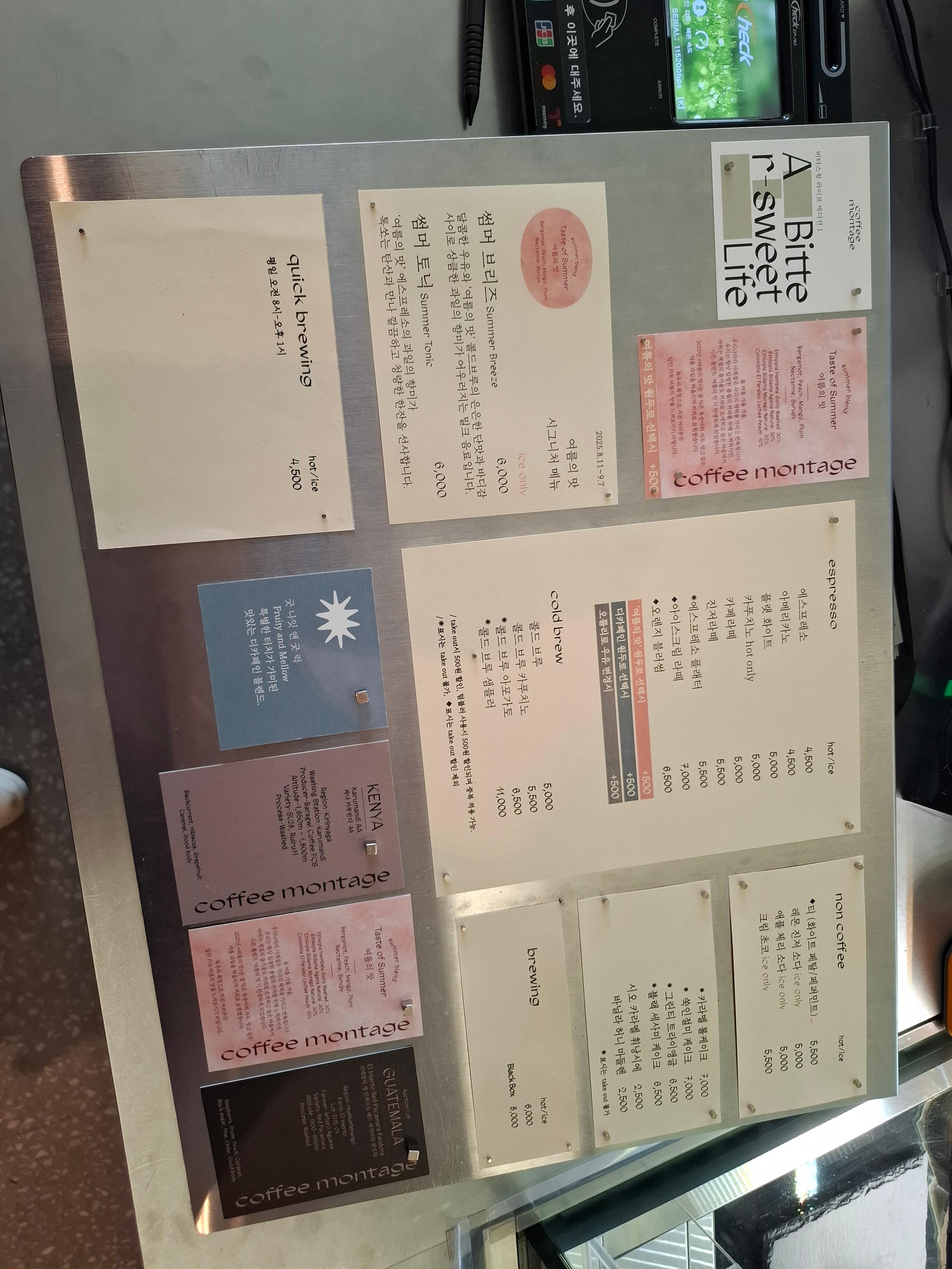 카운터에 놓인 메뉴입니다. 에스프레소 기반 커피부터 콜드브루, 브루잉 커피까지 선택의 폭이 넓었어요. 특히 시즌 블렌드인 '여름의 맛'이 궁금해서, 저희는 아이스 아메리카노 한 잔은 기본 블렌드로, 다른 한 잔은 '여름의 맛'으로 주문했습니다.