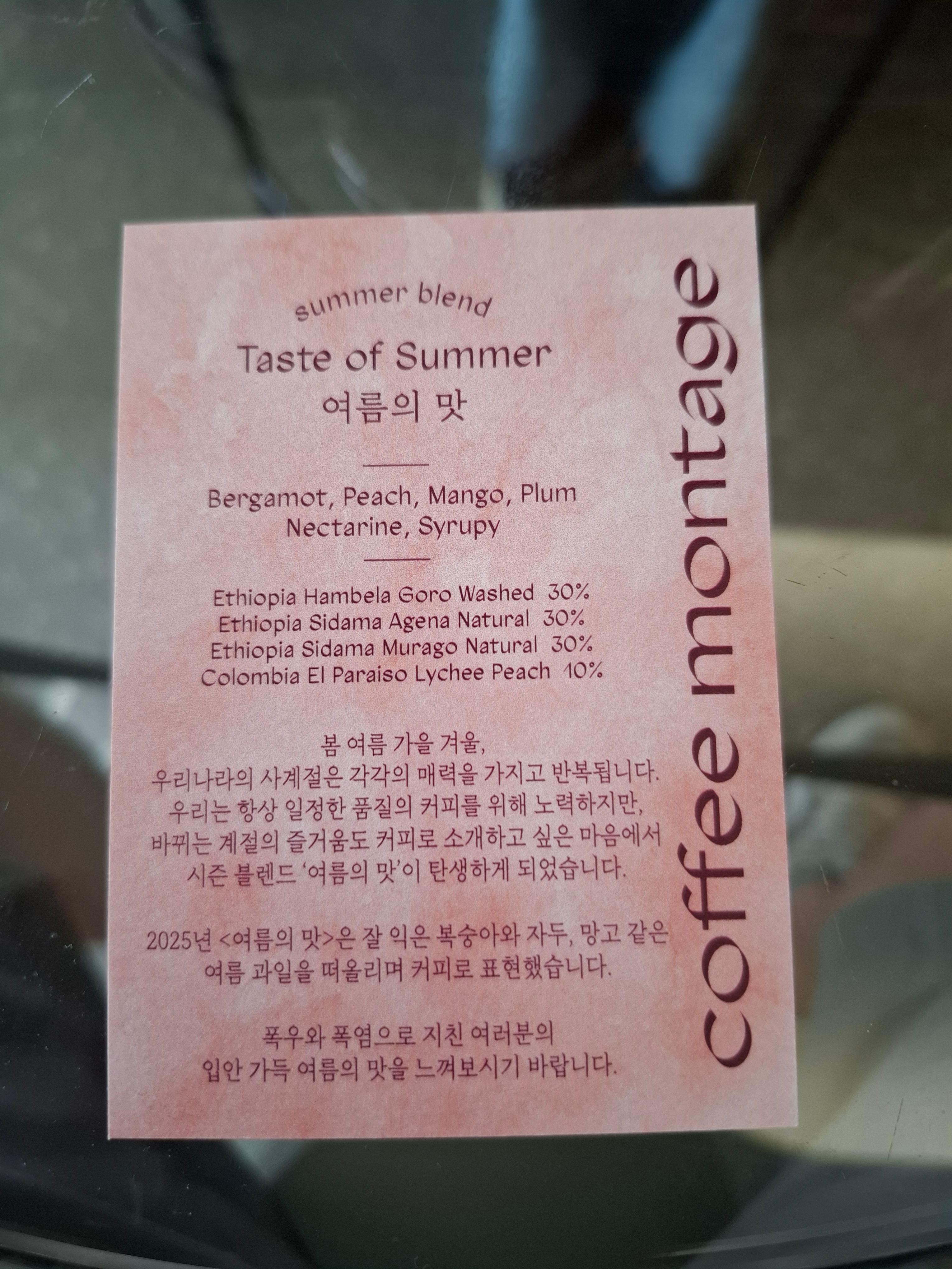이게 바로 저희가 주문한 시즌 블렌드 '여름의 맛'에 대한 설명 카드입니다. 베르가못, 복숭아, 망고, 자두, 천도복숭아... 커피에서 이런 맛들이 난다고? 처음에는 믿기지 않았어요. 2025년 여름의 맛은 잘 익은 복숭아와 자두 같은 여름 과일을 떠올리며 표현했다고 하네요.