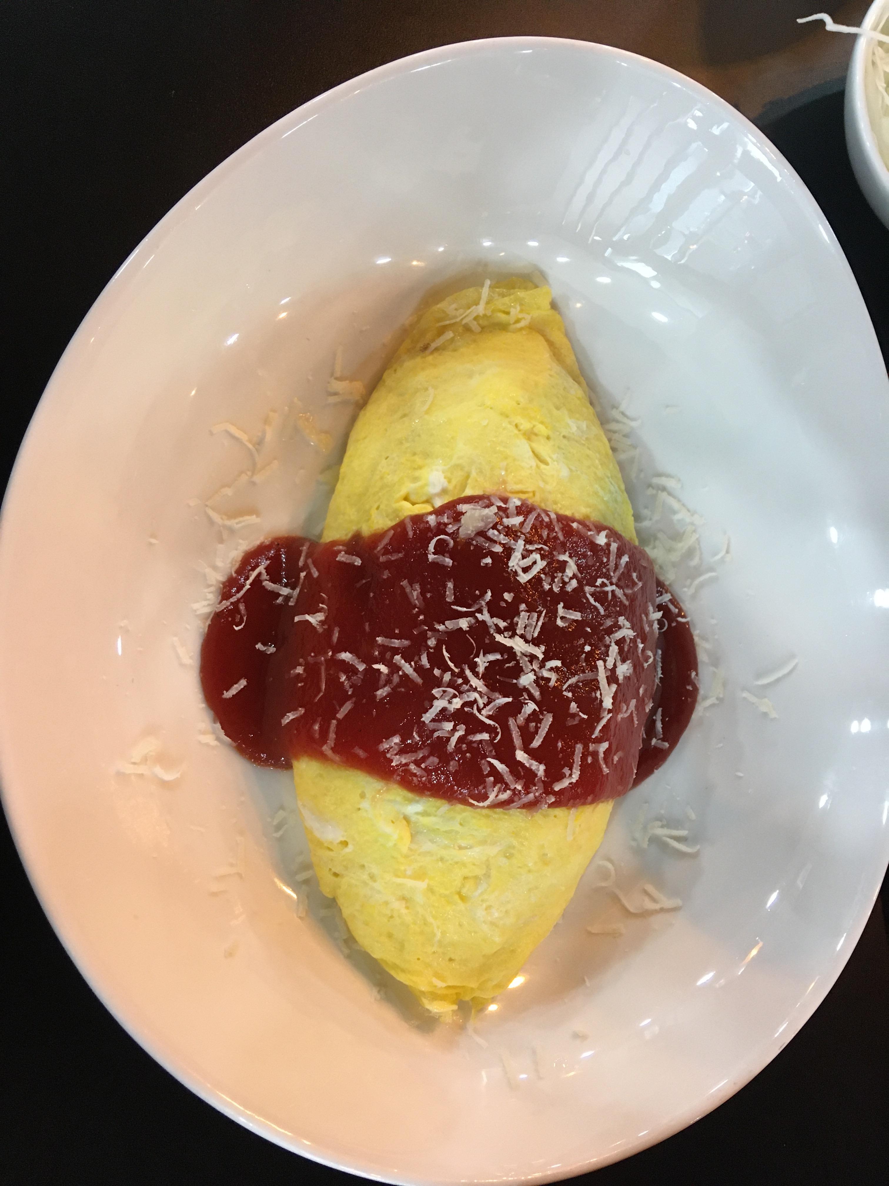 우리는, 치즈오므라이스와 페퍼카츠를 주문했다.